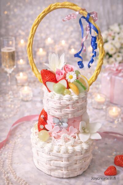 食品サンプル ホールケーキ2段 フラワー&フルーツ バスケット風 clay cake