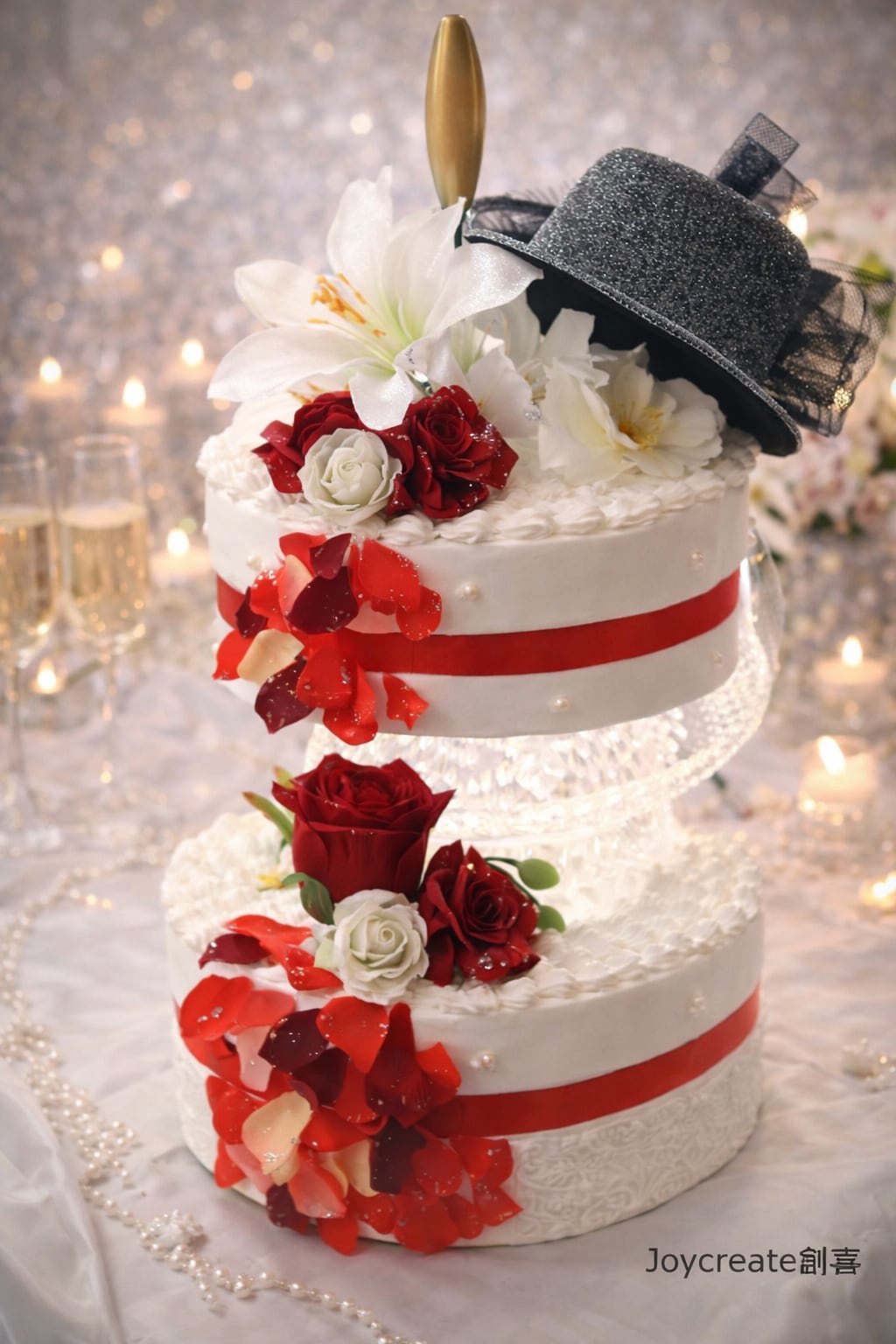 幸せの出発(たびだち)帽子とベールをメインモチーフに、濃赤のバラを加えて、