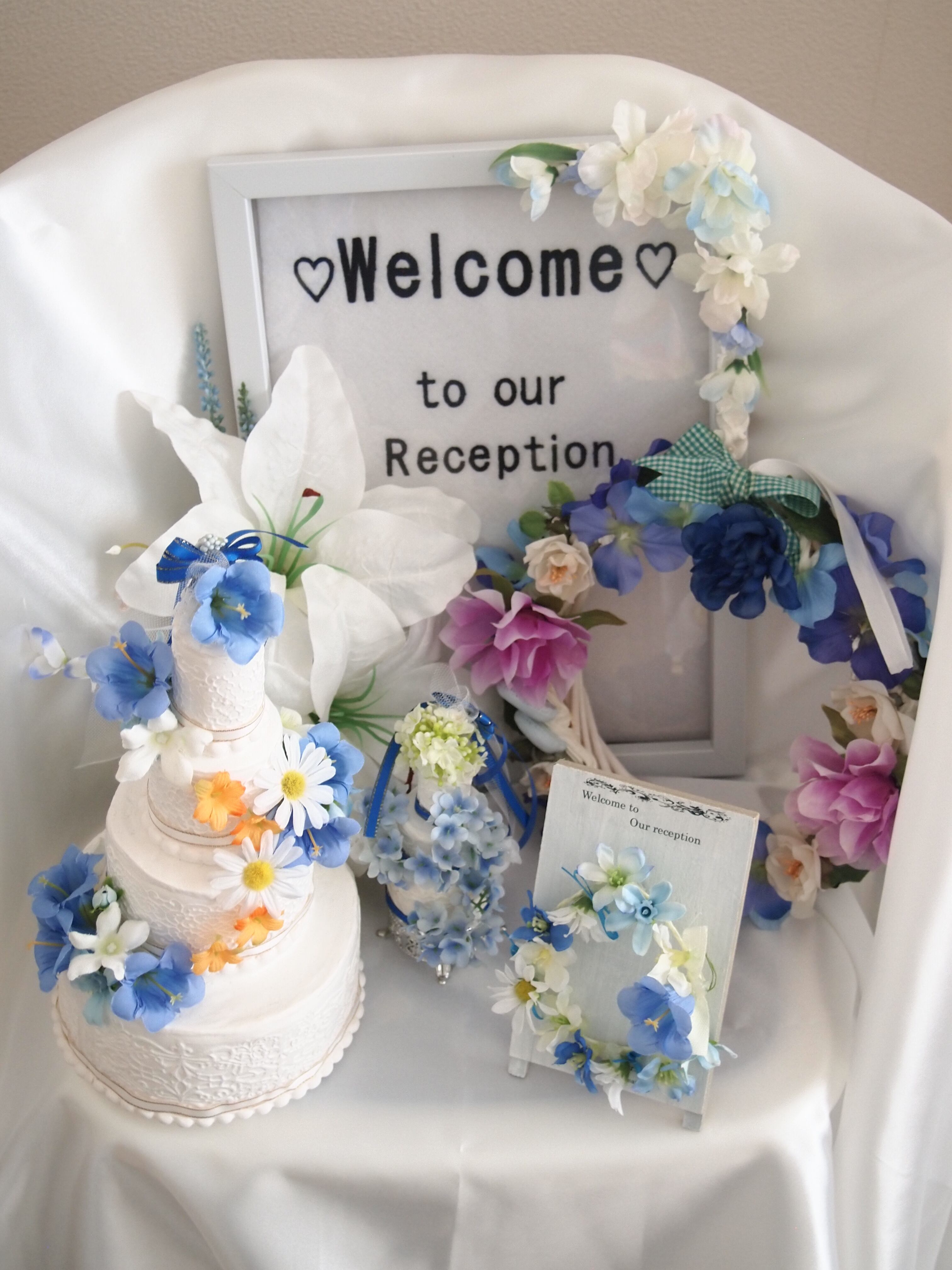 リース&ダミーケーキがあることで、ウェディング ウエルカムスペースの